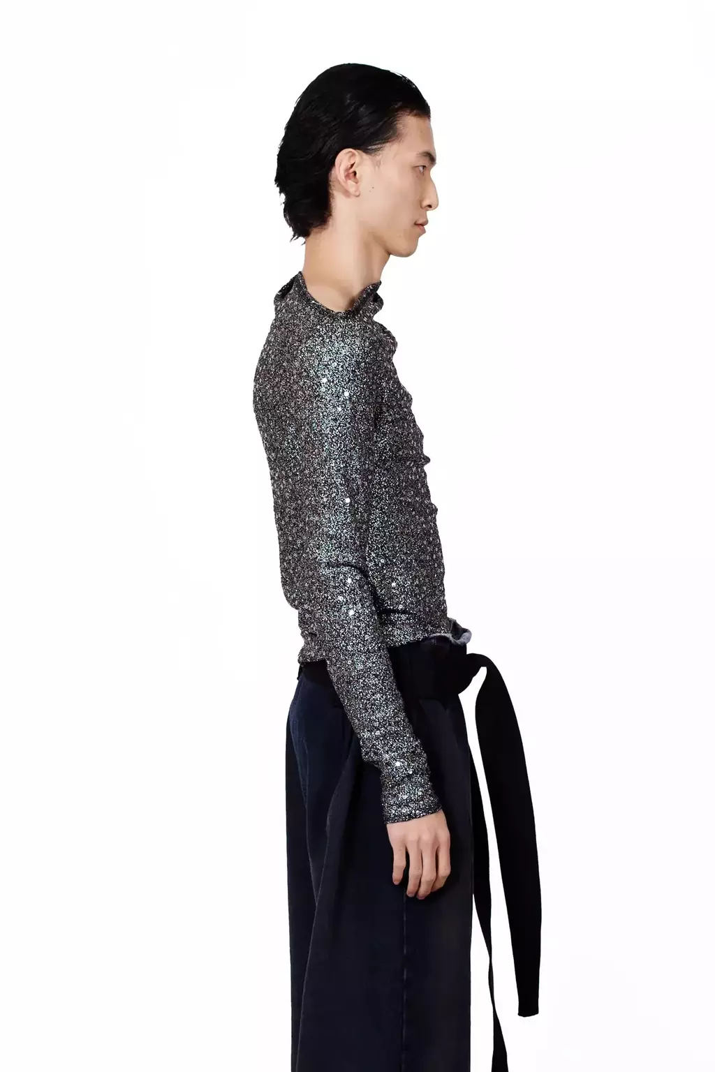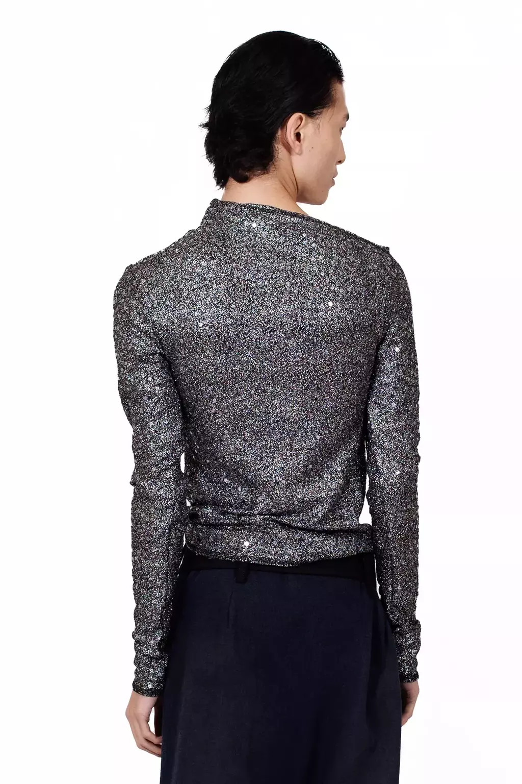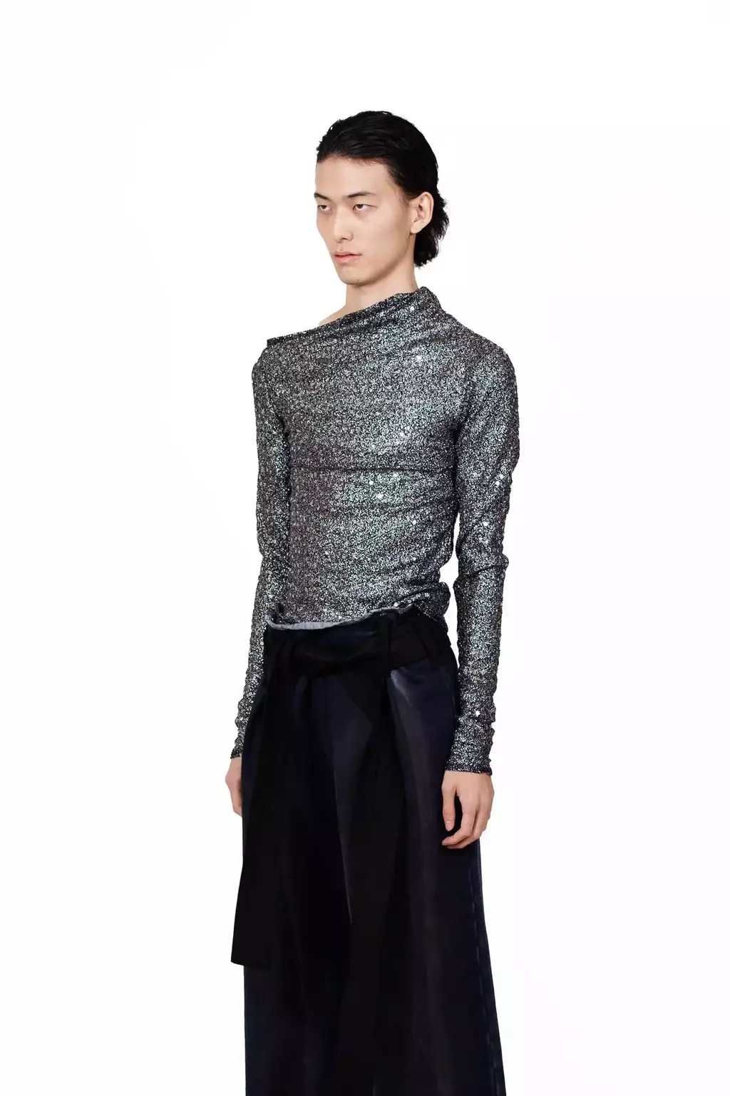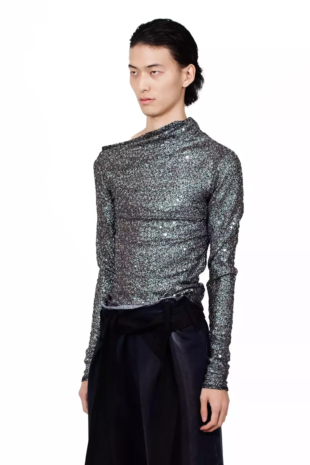 Top de cuello asimétrico y manga larga, confeccionado en lycra de algodón bordada en lentejuela.